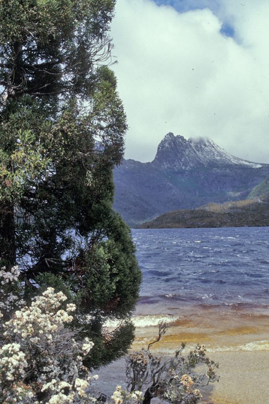 | Cradle Mountain und Dove Lake mit Thymian-Heide, Thyme Heath, Epacris serpyllifolia im Vordergrund. Sie ist in den Bergwäldern Tasmaniens verbreitet. Im Süden Australiens, in den Bundesstaaten New South Wales und Victoria findet man die Pflanze ebenfalls. Früher bildeten die Epacridaceaen eine eigene Familie. heute werden sie den Heidekrautgewächsen zugerechnet. Australian Native Plants Society |