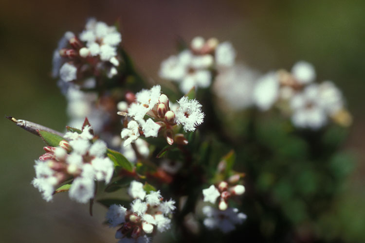 | "Die Weiße Bart-Heide", White Beardheath wurde früher in die eigene Familie der Epacridaceae gestellt. Neuerdings werden sie in die Familie der Heidekrautgewächse (Ericaceae) eingeordnet. Leucopogon collinus ist eine sehr häufige und weit verbreitete Art. Es ist ein aufrechter Strauch, der verbreitet in Heiden und trockenen Sclerophyll Wäldern vorkommt. |