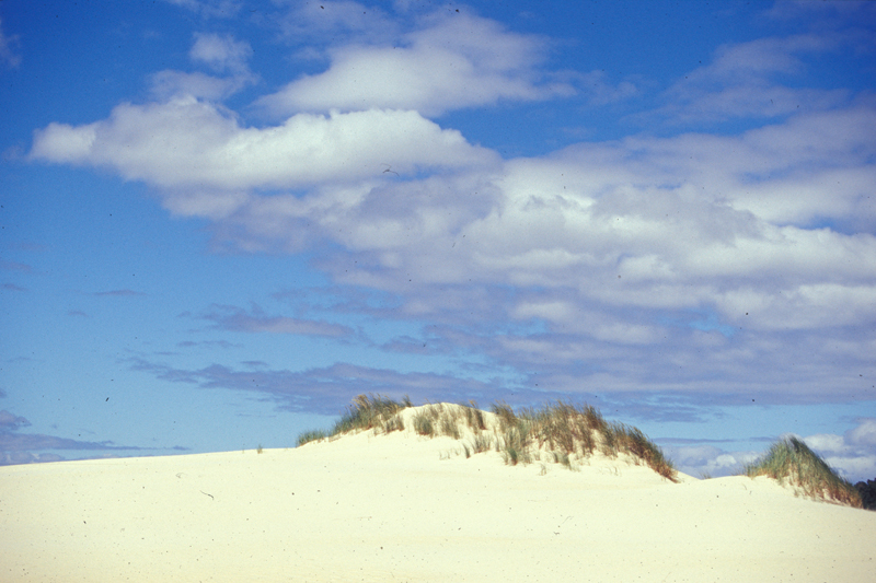 | Die Henty-Dünen sind von Strahan aus gut zu erreichen. Mit Bepflanzung wird versucht, die Düne zu befestigen. Will man aber über die Dünen an den Strand, so kann man nur die Wege der Quadfahrer nutzen. Sonst versperrt undurchdringliches Akaziengebüsch den Weg ans Meer. |